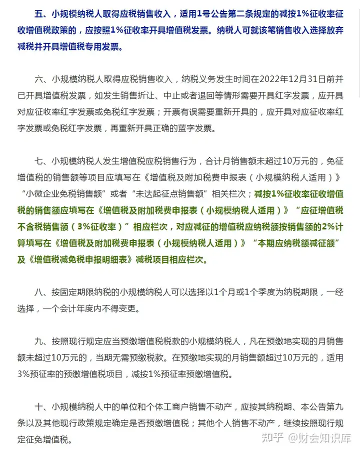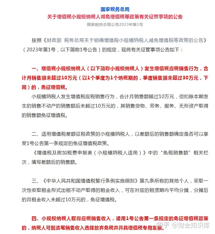 按照《财政部 税务总局关于明确增值税小规模纳税人减免增值税等政策的公告》(2023年第1号,以下简称1号公告)的规定,现将有关征管事项公告如下: