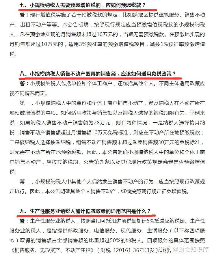 答:现行增值税实施了若干预缴税款的规定,比如跨地区提供建筑服务、销售不动产、出租不动产等等。本公告明确,按照现行规定应当预缴增值税税款的小规模纳税人,凡在预缴地实现的月销售额未超过10万元的,当期无需预缴税款。在预缴地实现的月销售额超过10万元的,适用3%预征率的预缴增值税项目,减按1%预征率预缴增值税。