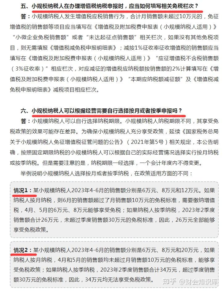 情况2:某小规模纳税人2023年4-6月的销售额分别是6万元、8万元和20万元,如果纳税人按月纳税,4月和5月的销售额均未超过月销售额10万元的免税标准,能够享受免税政策;如果纳税人按季纳税,2023年2季度销售额合计34万元,超过季度销售额30万元的免税标准,因此,34万元均无法享受免税政策。