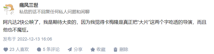 阿凡达2上映之前我就说过,卡梅隆是真正吃透了“大片”两个字的人,过去十几年的漫威潮跟老卡拍的大片根本不是一个东西,不仅老卡,多位好莱坞名导都批过漫威。
