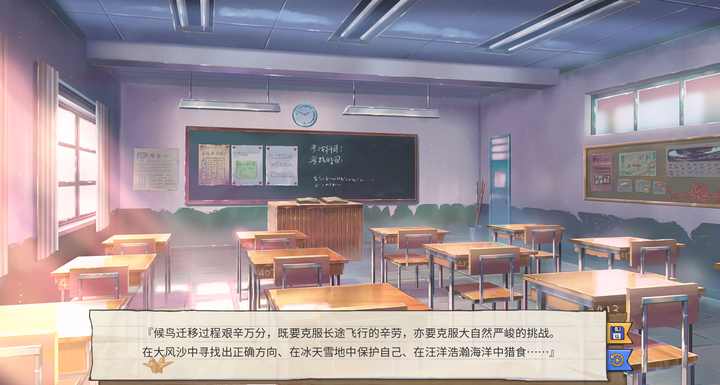 《候鸟》的Steam评论区里铺天盖地全是“电子劝学”的感叹,怎么说呢,其实我最初写剧本的时候是很担心的,毕竟谁玩Galgame是为了看别人做题啊?但不写又不行,学习是贯彻整个游戏的重要内容,所以只能硬着头皮写,然后尽量调整相关桥段出现的节奏,避免过于沉迷学习而使得过程无聊。