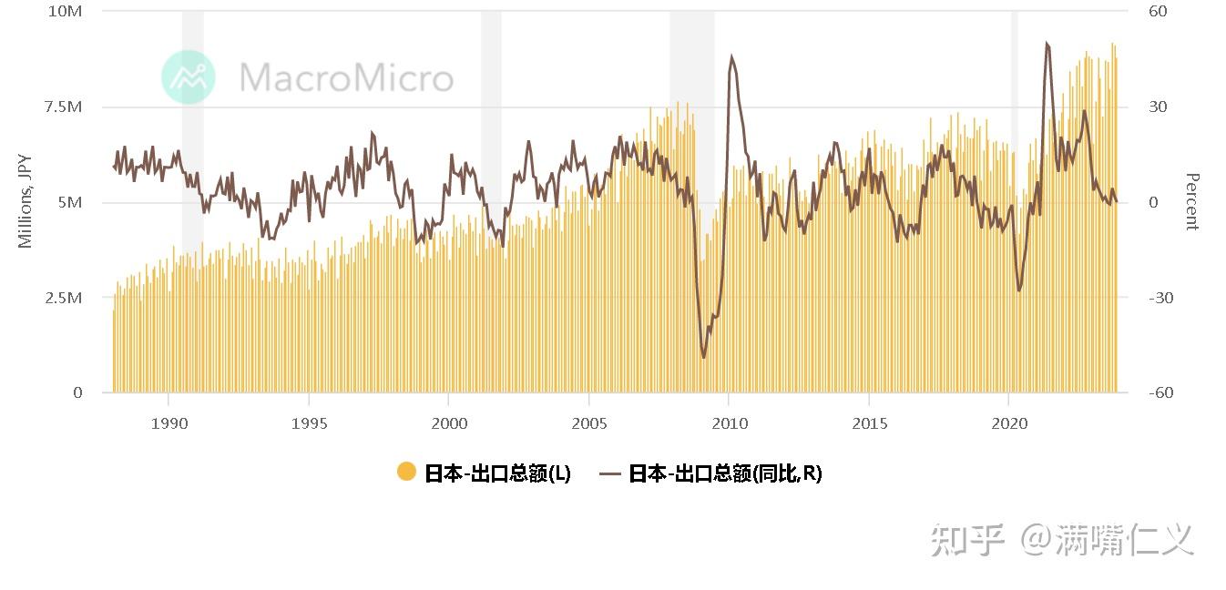回顾1990年代的日本,现在很多人把日本的衰退原因扣在日美广场协议头上,但是日本广场协议发生事件是在1985年9月,而日本股市高点发生在1990年,房产价格高点也是在1990年代初期,日元这段时间兑美元升值20%。日本央行为了压制住日本疯狂的资产泡沫趋势,利率从2%一直升息到6%。日经的疯狂打住了,日本的房地产疯狂打住了。由此陷入了长达30年的衰退。那么这个到底和广场协议有没有直接关系呢?有关系,但是关系并没有印度媒体所说的那么大。因为日美汇率主要影响的是出口,日元升值日本商品价格上升,在1980年代,日本汽车出口超过美国成为世界第一汽车出口国,日本半导体行业的迅速升起,包括家电行业的迅速做大,造成了日美贸易的巨大顺差,逼迫美国出现了砸日本车的现象,美国政府强迫日本政府签下广场协议,强迫日元升值,那么我们可以对照,从1985之后的出口数据来看,到底有多大影响?