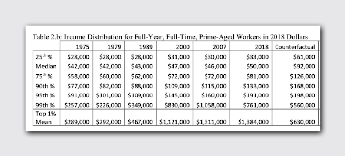 对于一名年收入为 $50,000(2018年中位数收入)的全职工人来说,假设延续了 1945-1974 较为平均的收入分配政策和同样的经济增长水平,他在 2018年的收入在做出通胀影响调整后应该是: $92,000 -- $102,000 (具体数字的差异来源于通胀的不同计算方式)