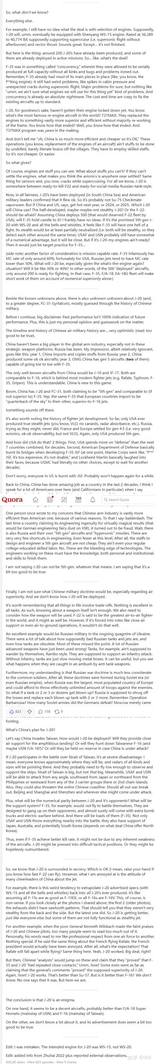 翻译一篇 Quora 上老外对于 歼-20 看法的高赞回答(不代表本人看法,原文链接及全文在后)。