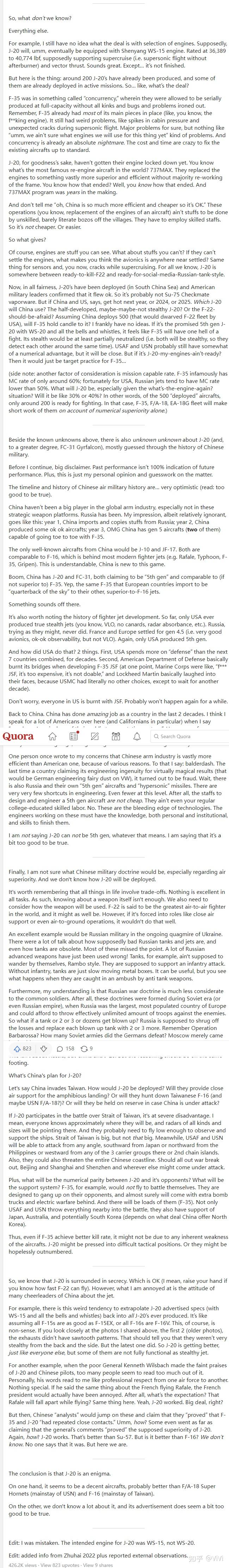 翻译一篇 Quora 上老外对于 歼-20 看法的高赞回答(不代表本人看法,原文链接及全文在后)。