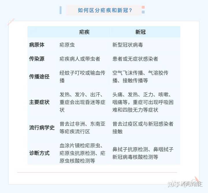 传播途径:新冠主要是经呼吸道飞沫和密切接触传播;疟疾主要经媒介按蚊叮咬传播或血液传播。