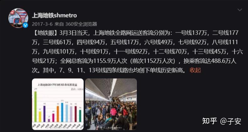 然后再看一下2023年2月17日。当天上海地铁全网客流1194.7万,4号线客流为69.8万。数据来源见图片中的水印。虽然不是官方发布的数据,但相信它是正确的。也非常感谢“阿牛”让大家看到了现在已经很少公布的上海地铁分线客流。