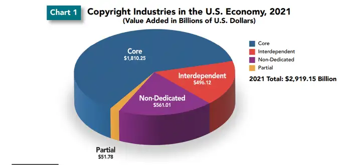 在 2021 年核心版权产业在美国名义 GDP 中所占份额保持在 7.76%。整个版权产业的 GDP 为 2.919 万亿美元,占美国 GDP 的 12.52%。