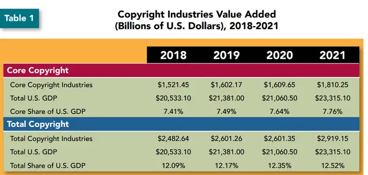 2021年,版权产业占美国GDP达到12.52%。