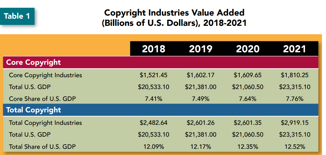 在 2021 年核心版权产业在美国名义 GDP 中所占份额保持在 7.76%。整个版权产业的 GDP 为 2.919 万亿美元,占美国 GDP 的 12.52%。