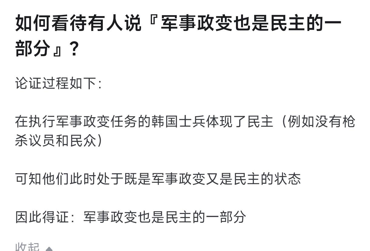 而韩国处在即使军事政变又民主的状态怎么推导出军事政变也是民主一部分的?正常人的想法不是军事政变破坏民主制度,护宪派与军变者两股力量并存同时做斗争么?