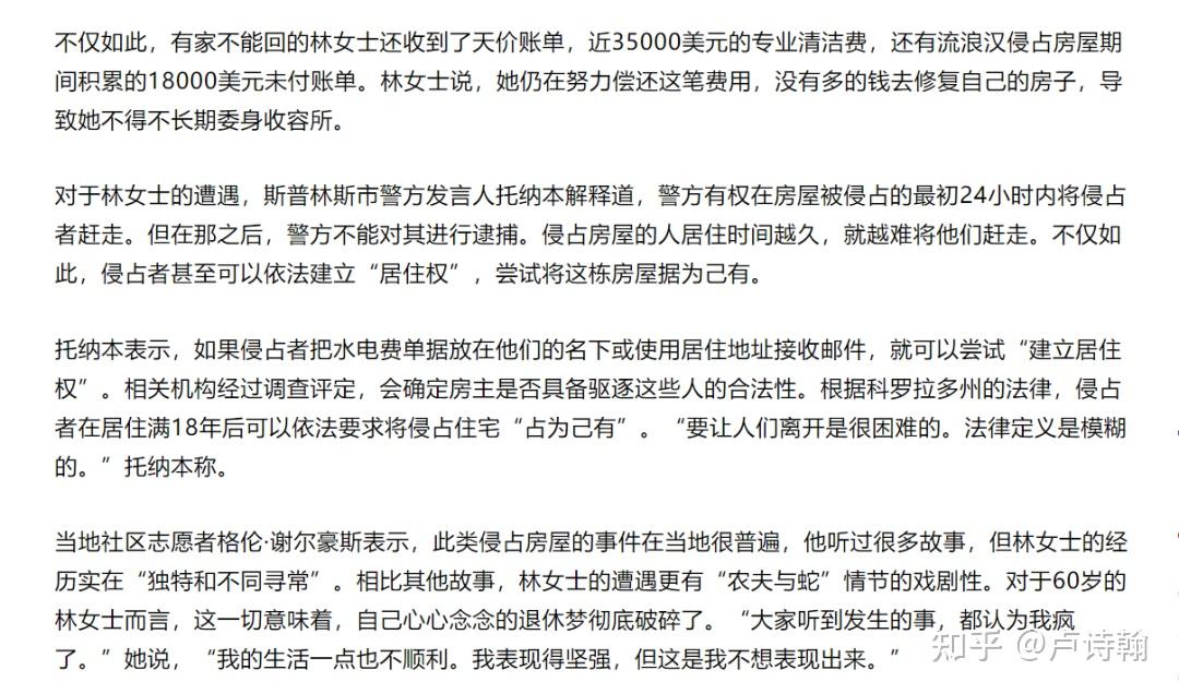 比如美国科罗拉多州的林女士,房屋被占了拿不回来,报警后警方的回应是,根据科罗拉多州法条:警方有权在房屋被侵占的最初24小时内将侵占者赶走。但在那之后,警方不能对其进行逮捕。侵占房屋的人居住时间越久,就越难将他们赶走。