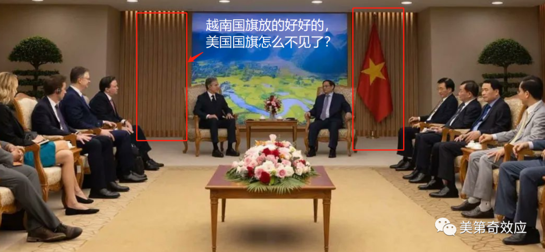 正常来说,国与国之间平等,挂了越南旗肯定要挂美国旗的。没挂国旗,这是直接把布林肯的国事访问,降级成了私人唠嗑?还是不认为拜登内阁可以代表美国政权,是非法政府?还是美国是越南藩属,没资格挂旗?美国一战胜利之后,从来没有遭到如此奇耻大辱。