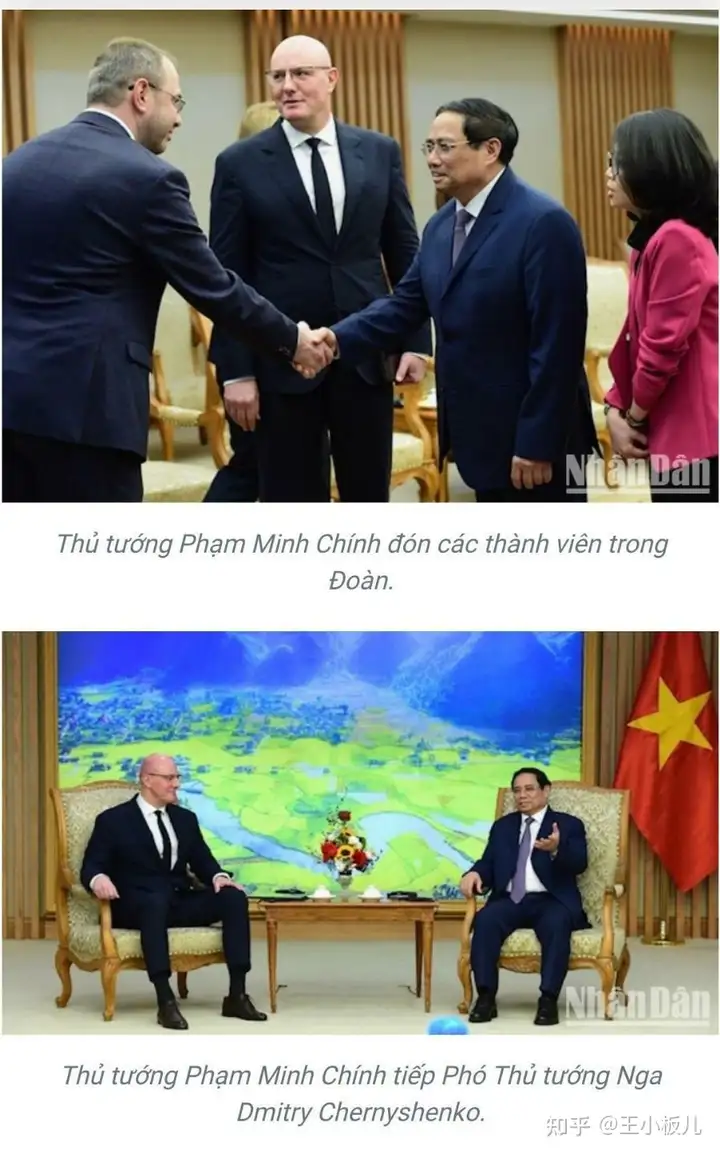 鉴于有小伙伴提到越南总理范明政会见俄罗斯副总理德米特里·切尔内申科的时候,在同一场合也没有放置俄罗斯国旗,我特意去vietnam+(越通社)浏览了近期会见的一些照片。