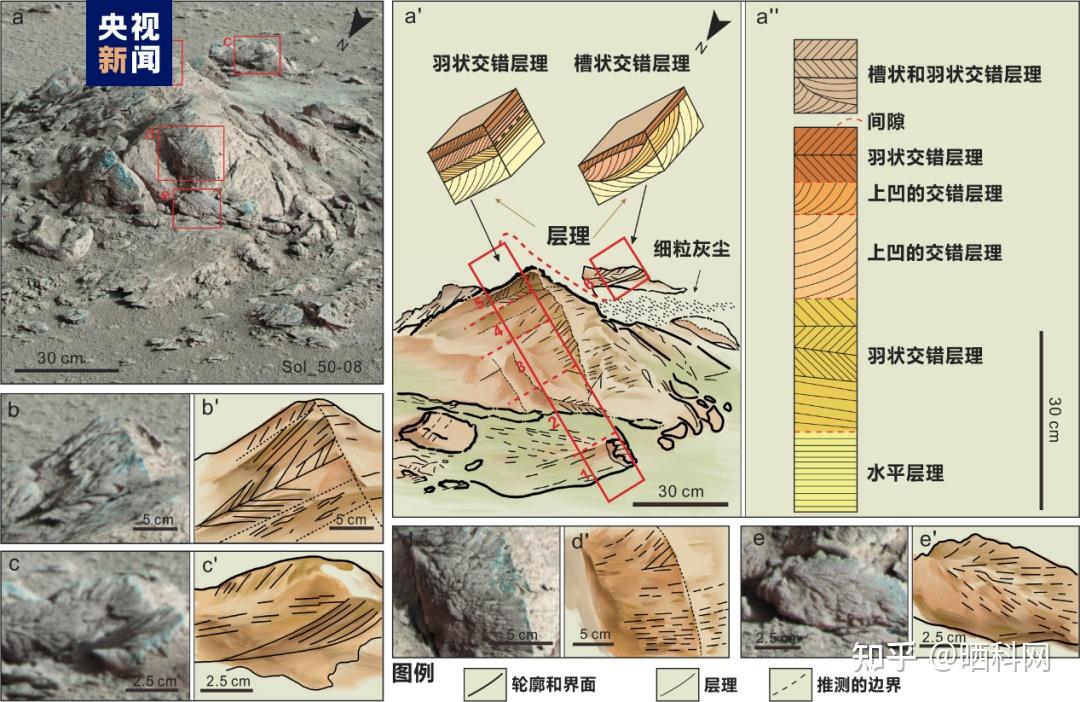 基于MSCam获取的岩石影像,肖龙教授研究团队详细分析了“祝融号”火星车巡视区内石块的表面构造。由于所观测的岩石都位于祝融巡视区内,研究团队将其代表的地质单元命名为:祝融段。研究团队在研究中发现段内的岩石通常保留有局部呈透镜状的交错层理组构,以多种小型交错层理为主,伴随少量透镜状压扁层理和小型水道结构的沉积构造(图2)。