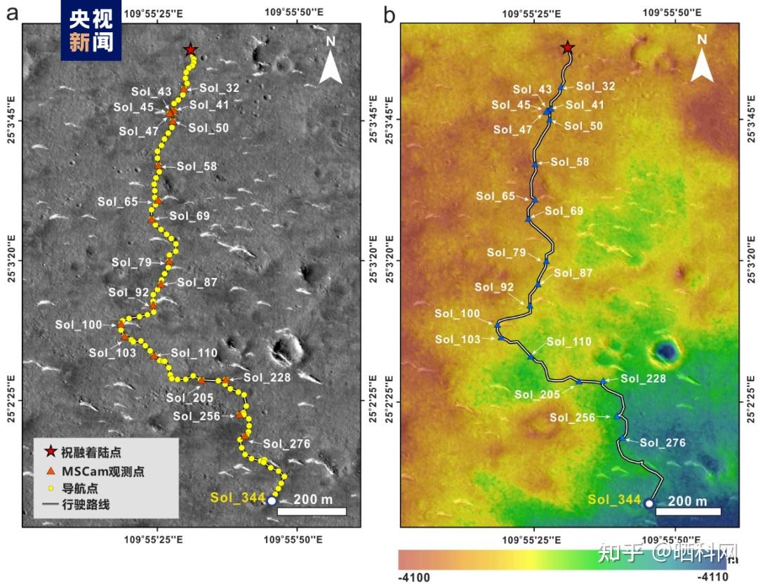 自着陆以来,“祝融号”一直在向南驶向潜在的海岸线区域,并对沿途出露的北方荒原组地层展开观测。“祝融号”行驶了约1921米(图1),使用不同的成像和分析系统对露头和地表岩石进行详细的就位观测,其中导航和地形相机已经获得了106组全景图像,详细记录了“祝融号”行进路线附近许多岩石的表面形态与构造特征。