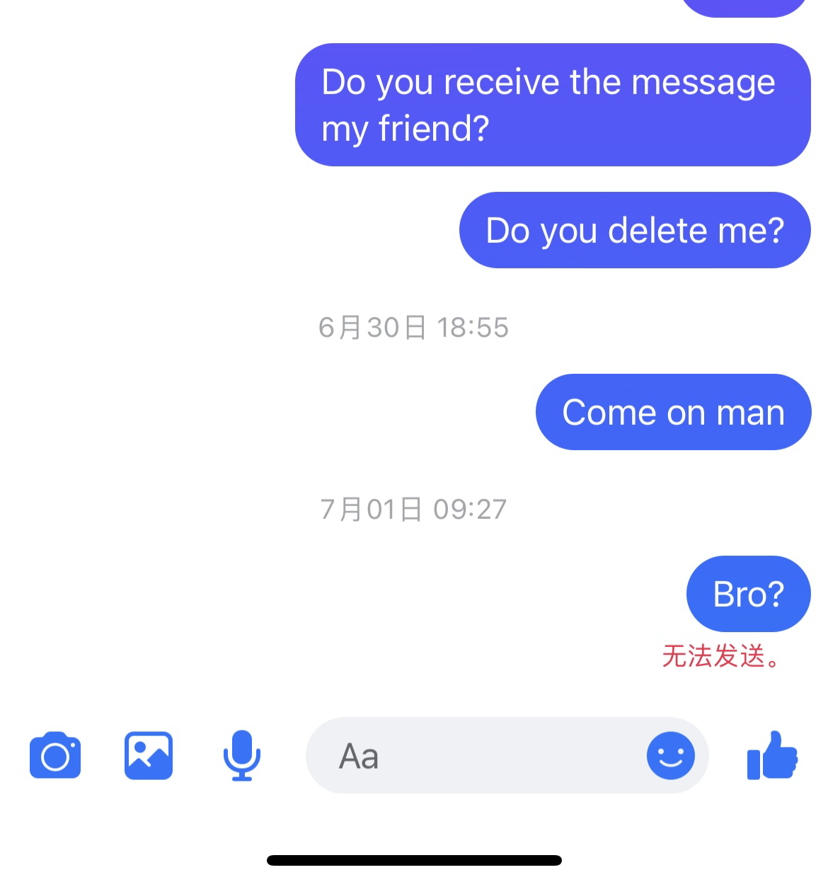 在我发完上面这条消息,想再跟他确认一下发货时间的时候,就显示无法发送了。