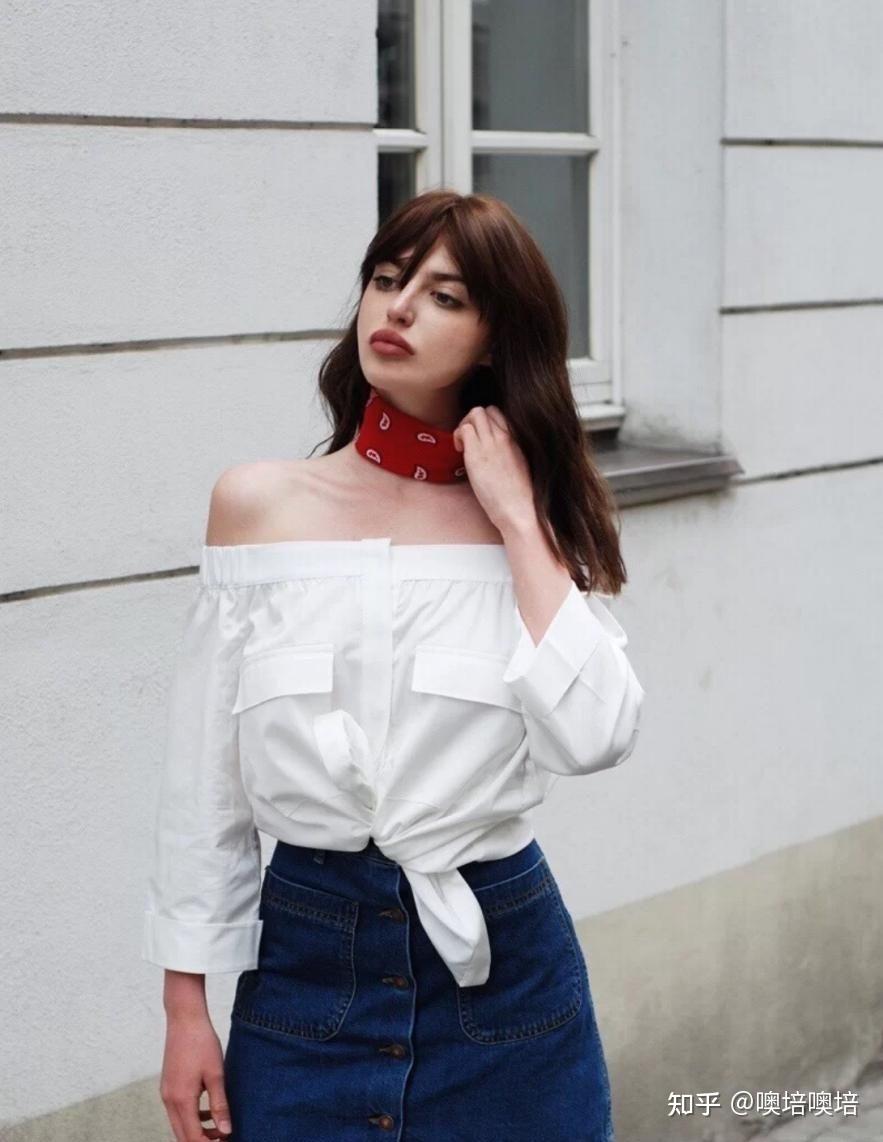 比如这里示范的:一件面料硬挺的白色衬衫,直接拉平当一字领穿,横向的线条将胸部到肩膀的区域进行线性分割,让胸部薄了不仅一寸,原本古板朴素的衬衫,也被这突如其来的改变而开始散发美艳优雅的味道。一根红色的项圈点缀在颈间,恰好坐落在锁骨的位置,浪漫古典的法式情调缓缓彰显,牵动着观赏者的眼睛,这些细节都足以让人忘却穿着者似乎并不是特别完美的身材。