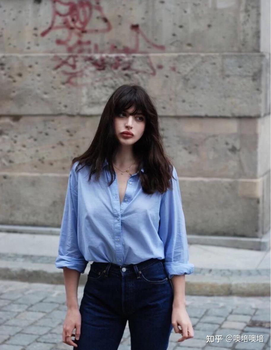 像是上图这件水洗蓝色的衬衫,干练的肩线配合着张弛有度的廓形,将飒爽大气与随性自在两种风格都维护得滴水不露,胸部轮廓也被修饰的恰到好处,将领口解开露出锁骨,袖口挽上去露出手腕,这些细节都能觅得一份职场风之外的松弛与慵懒之感,根本无需多余的装饰来喧宾夺主,简单极为高级。