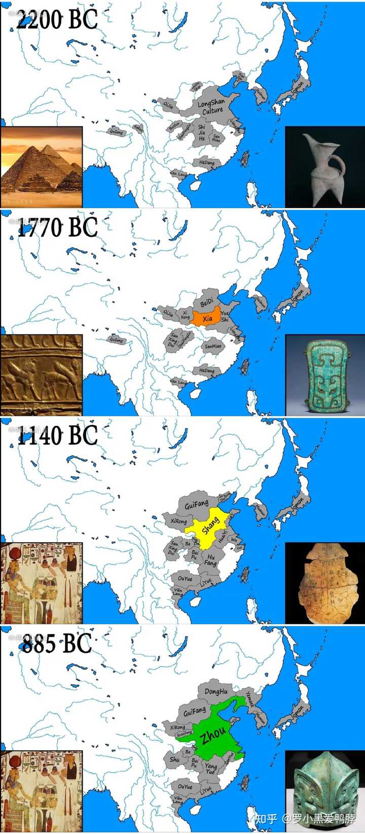 后来,北狄的一支——商(也是夏人的古汉远亲,假定以夏朝势力范围为古中华,别部的叫夷狄,商人祖先叫做简狄,也符合狄是古汉人支系的理论)联合东夷,攻占了夏朝的首都,建立了商朝;再后来,西戎的一支——周(当然其实这并不是周定义的戎狄,有一种可能“华胥”、“夏后”的名字就是周给前朝起的,但可以理解的就是化外之地的另一波汉人成功地征服了原来的“天地盟主”)。某种意义上说,中国真正的改朝换代只有这两次,其他的都是内部造反,或者非汉人入侵建立的,最后又下台或被赶走了。