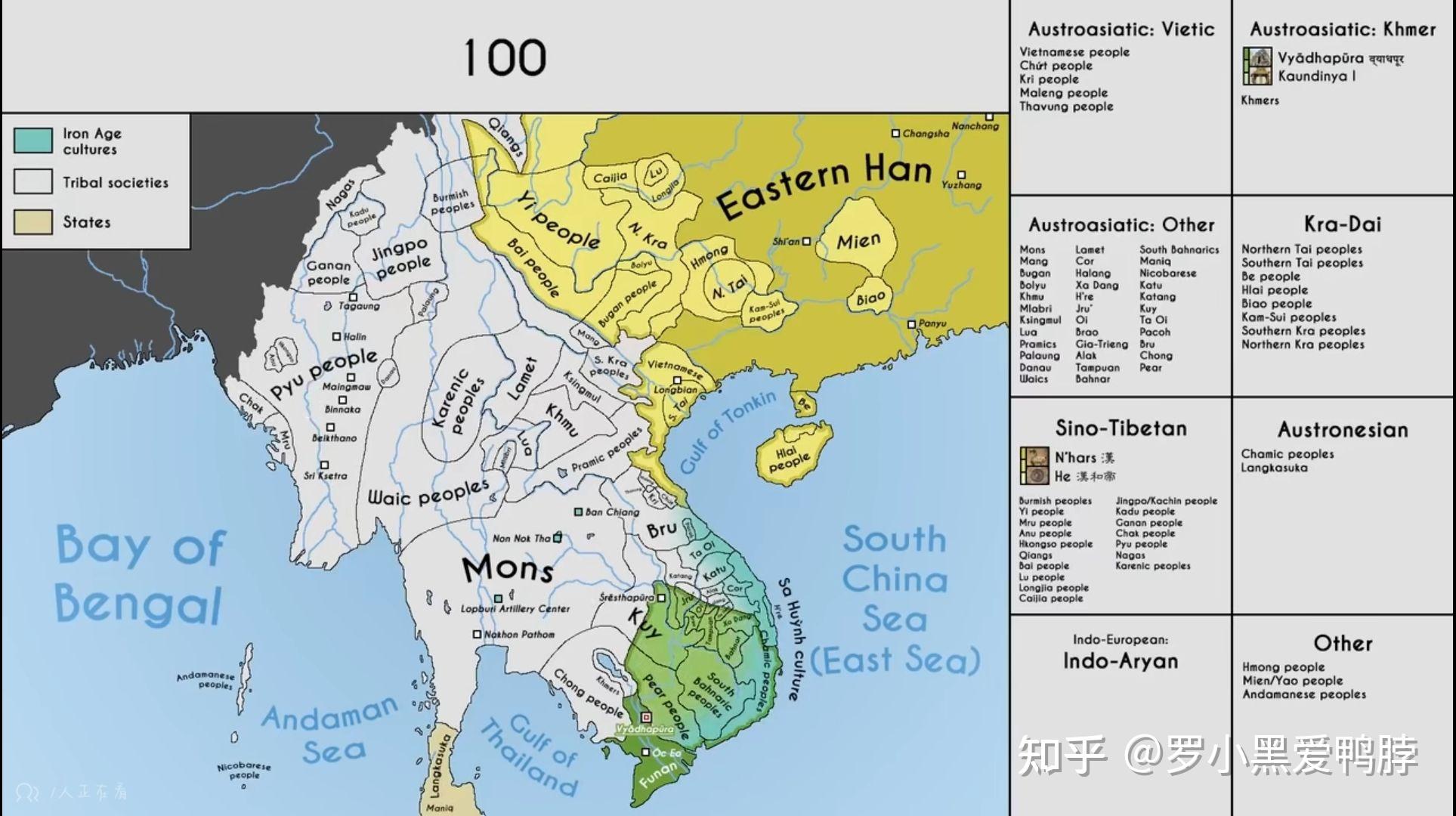 汉朝(100AD)时期东南亚形势图 苗瑶语、壮侗语原始人群只有两条路可以走:一条是某些地区的人,虽然中古时期早期语言上仍然是苗瑶语、壮侗语主导,但已经成为中原王朝直接统治的编户齐民,也就是国籍上的“汉人”,而不被承认为是少数民族,最后逐渐融入汉族人群当中;另一条路更惨,那就是保持类似于“国中国”的部落制度,连“人”都不能算,被起一些带有歧视性的民族名称,不仅如此,当人地矛盾激化的时候,还可能发生大规模流血事件,最终化外之地的苗瑶语、壮侗语人群可以说基本上没有后代了,少量的后代中大部分就是今天的某些少数民族。