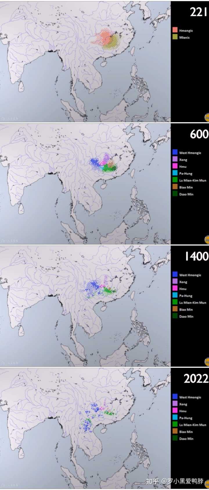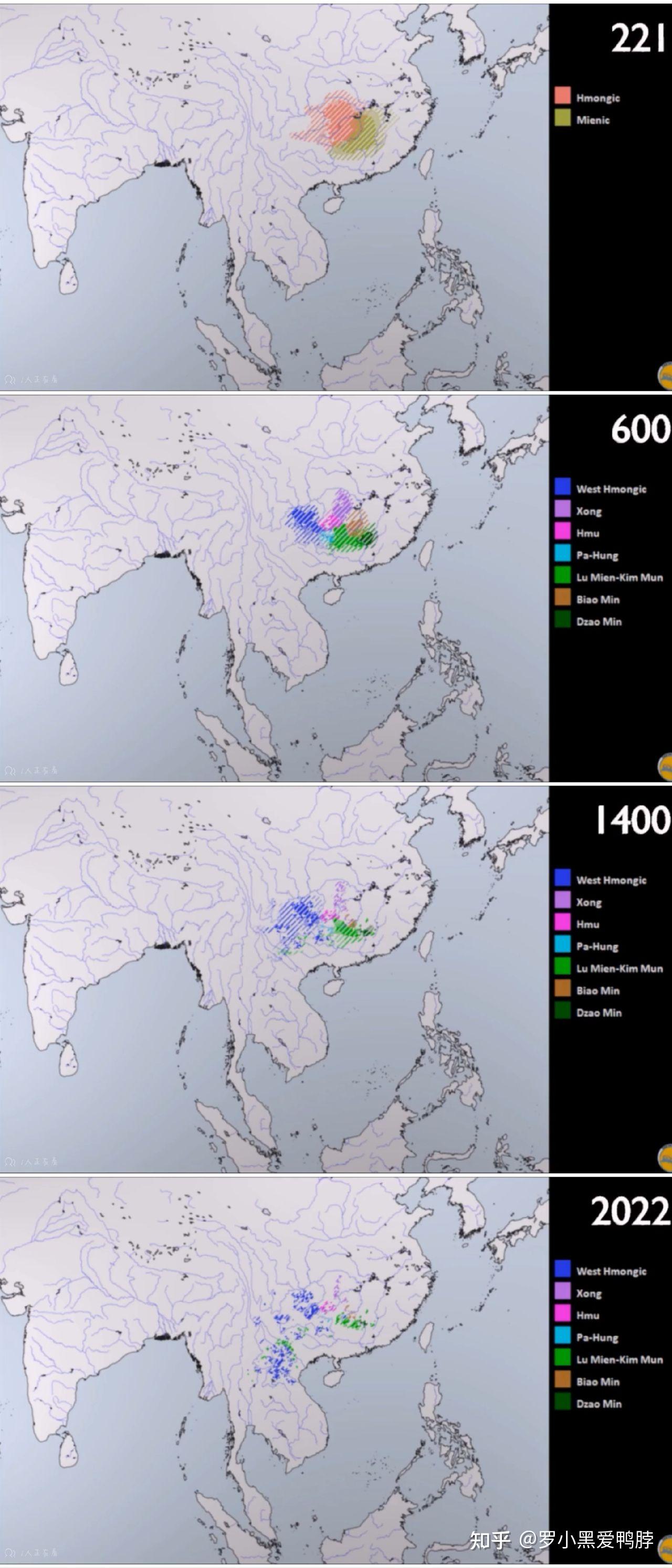 苗瑶语系的演化(221BC-2022AD) 有一句话叫做“胜者恒胜,败者恒败”,自打汉人据有了长江流域、黄河流域的大部分平原地区之后,苗瑶语、壮侗语、蒙古语、突厥语、藏缅语人群就彻底失去了与古汉人的抗衡能力,而当汉人形成了同一民族,一致对外之后,就进一步加快了其他语言的原始人群势力范围的缩小。