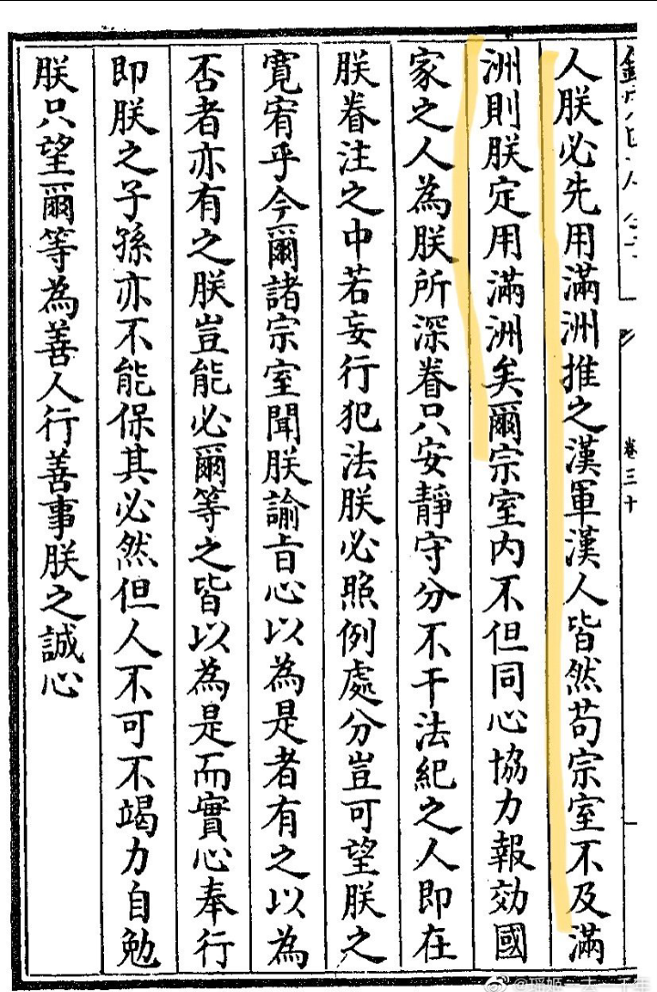惟望尔等习为善人,如宗室内亦有一善人,朕必先用宗室;满洲内有一善人,汉军中亦有一善 人,朕必先用满洲;推之汉军、汉人皆然。苟宗室不及满洲,朕定用满洲矣。”