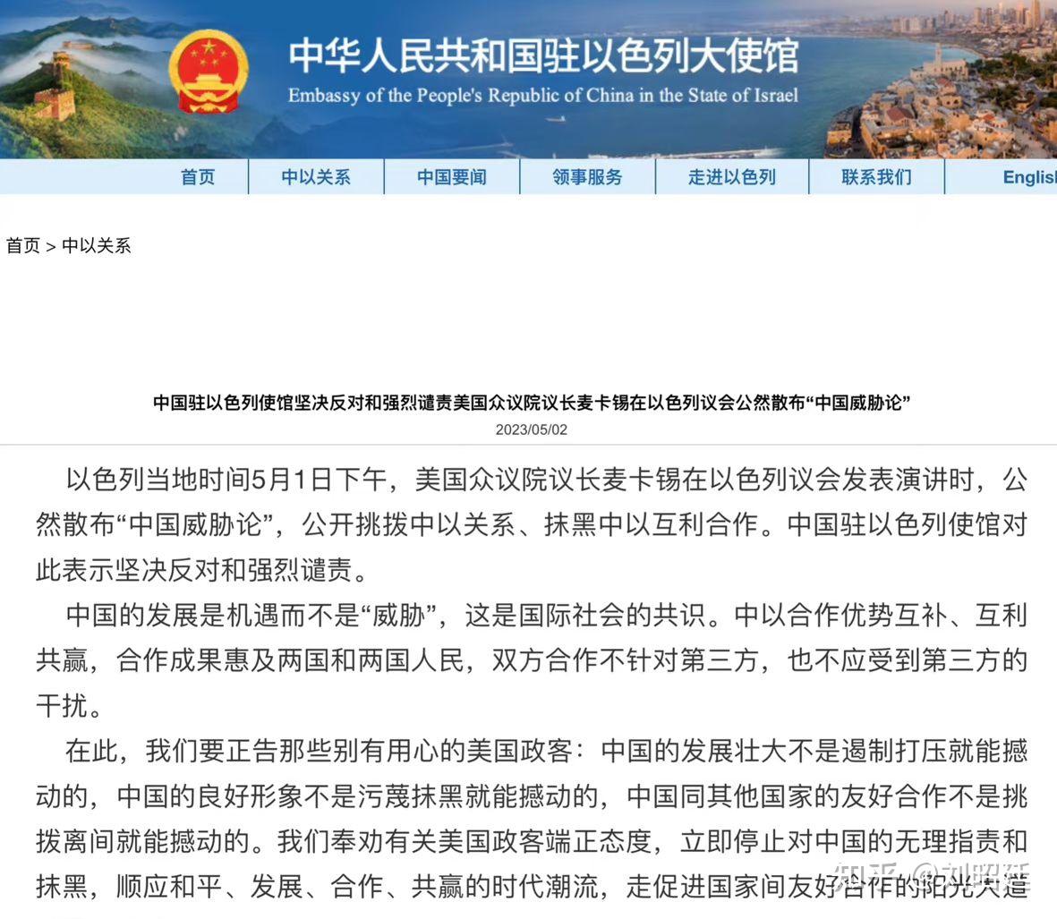 中国驻以色列大使馆 另一方面,中以关系也不错,至少在经贸合作,教育医疗农业领域,双方没有分歧,合作项目众多,前景也很广阔。就在上个月,我驻以色列大使馆还严正驳斥了麦卡锡就中以关系挑拨离间大放厥词。
