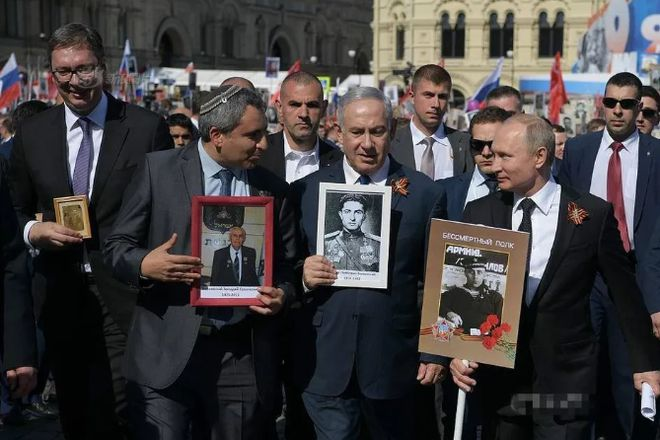 2018年5月9日胜利日当天在莫斯科举行的“不朽军团”游行活动中,内塔尼亚胡就举着苏联英雄沃尔夫·维连斯基上校的肖像。 同时全世界的犹太财团也是少见得慷慨了一把,要钱给钱要人给人。