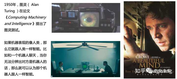 1950年代之前:理论萌芽与思想奠基 在人工智能概念之前,1950年,图灵( Alan Turing )在论文《Computing Machinery and Intelligence 》提出了图灵测试的概念,认为如果机器表现的像人类,那么它就跟人类一样智能。比如和一个机器人聊天,当你无法分辨出对方是机器人的话,那么就可以认为那个机器人跟人一样智能。