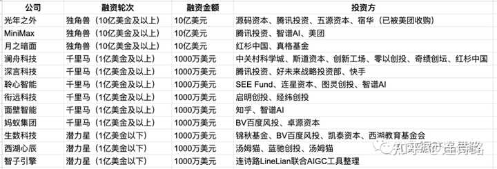 投融资本文由百万粉丝博主LineLian揭秘:AI创业项目的高效产品启动策略 从表格中可以看出,2023年大模型领域的投融资活动十分活跃,融资规模也不断扩大。其中,光年之外、MiniMax、月之暗面等公司获得了10亿美元以上的融资,成为独角兽企业。澜舟科技等公司获得了1亿美元以上的融资,成为千里马企业。生数科技、西湖心辰、智子引擎等公司获得了1亿美元以下的融资,成为潜力星企业。