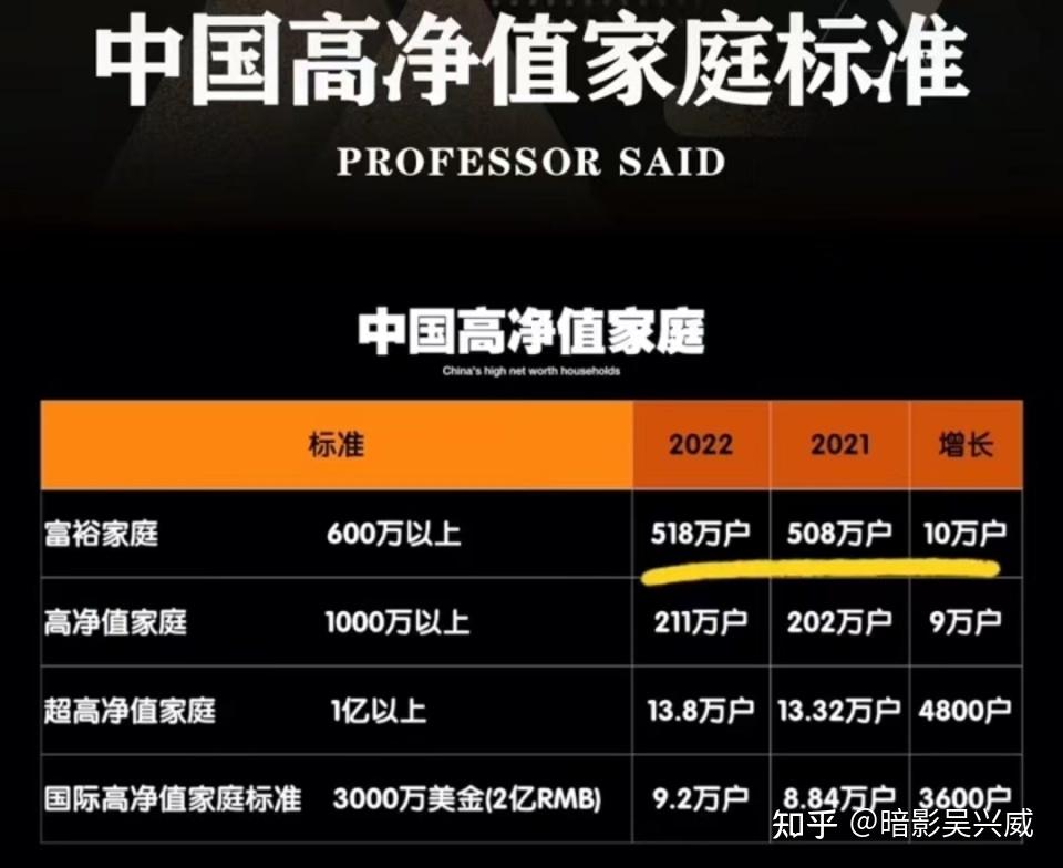 胡润榜2022年的数据显示,一个家庭(以户口本为单位)的总资产(包括房车、金银首饰等贵重财物、股票、基金、现钞、普通存款、理财,没有包括房贷的任何负债)超过600万,那就是富裕家庭,超过1000万就是高净值家庭。