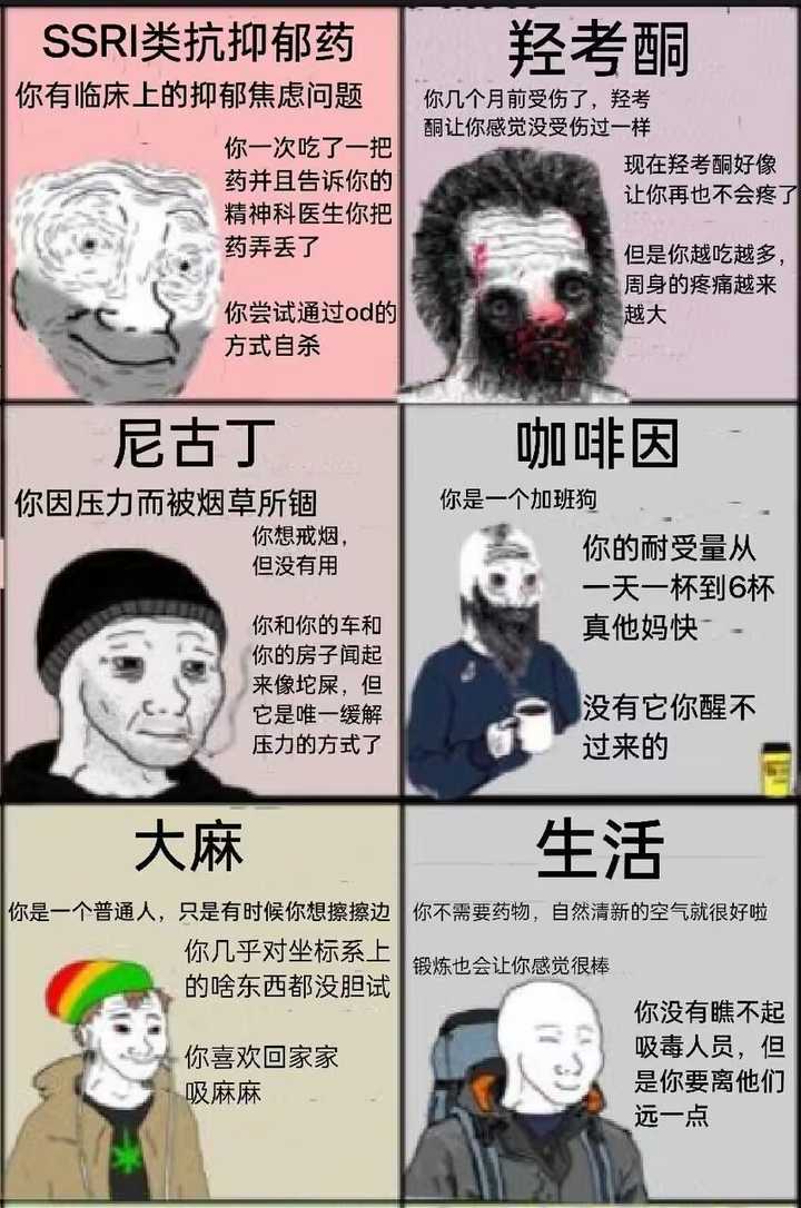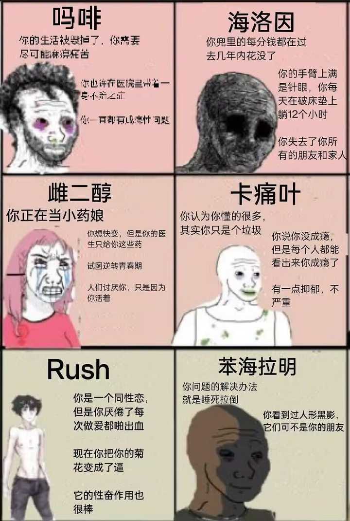 毒品和毒品的差距太大了,像海洛因和槟榔这种,对肉体摧残无可避免,一眼就能看出来。