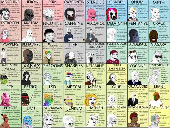 1 阿片类 比如芬太尼,海洛因,吗啡。是绝对不能碰的,稍微过量就可能心梗猝死。布林肯前两天来中国谈判,就有一个议题,请求中国别再出口芬太尼的前体了,美国芬太尼有点控制不住,原料大多来自中国。