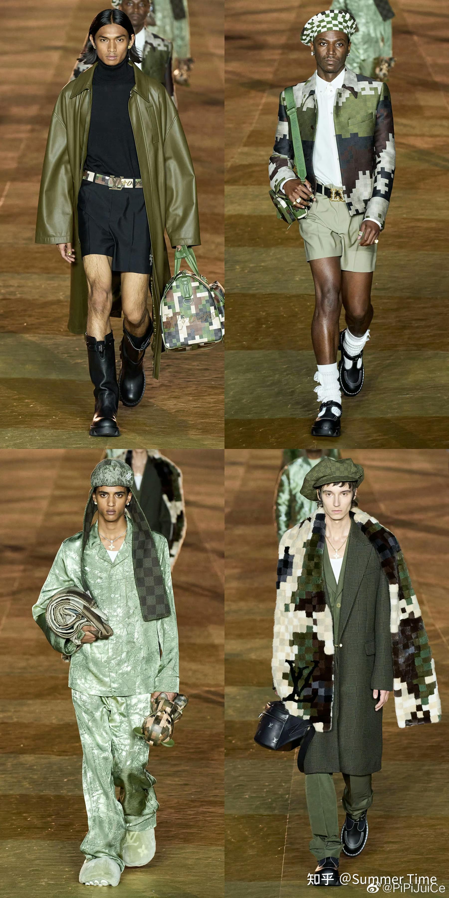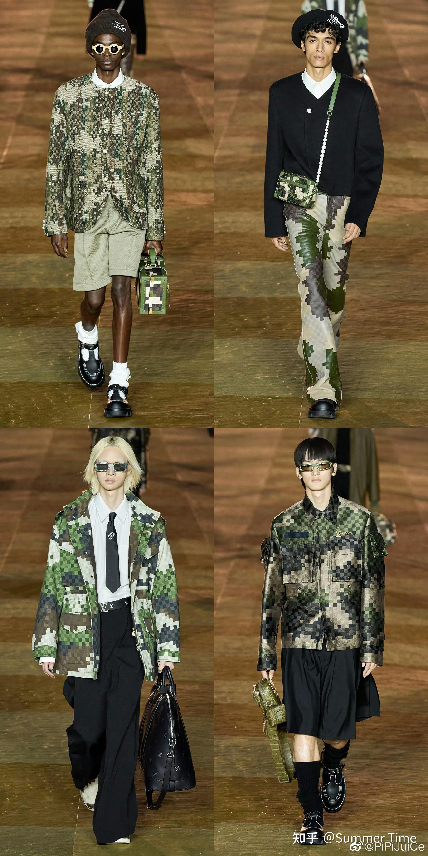 关于菲董这场首秀,时装博主们会聊be like:棋盘格,迷彩,珍珠,丹宁,整体造型巧妙混搭了服装上街头风格与装饰上的优雅华丽。可以预料这是一场商业化相当成功的发布,抓住了时尚圈,也将在几个月后迎来消费者抢购热潮。新印花以 LV 经典的 Damier 棋盘格为出发点,将其放大从视觉上打造像素质感,配以迷彩的黄绿,牛仔的蓝白色调,致敬了 LV 经典棋盘格设计,并带有 Pharrell 音乐人的不拘一格…
