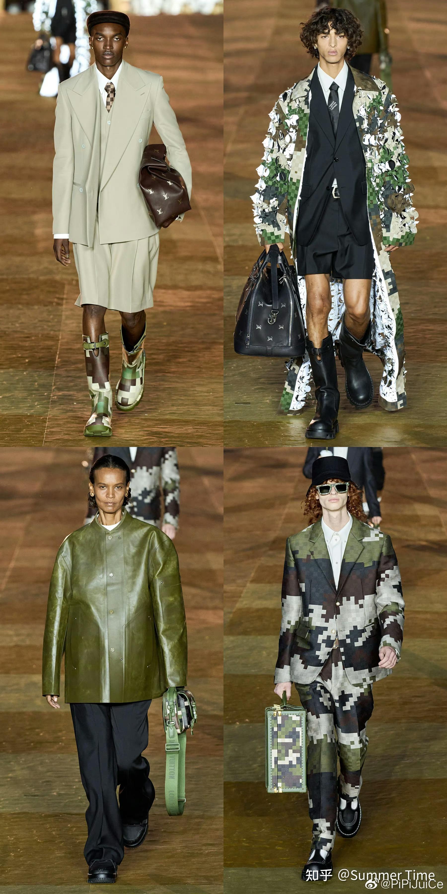 开场的音乐已经定了调,Virgil时代的童心,欢快风格消失不见,取而代之的是军绿,迷彩风格。近年来LV走的一直是潮牌化年轻化路线,年轻人通常文化方向上是追求自由和个性,Virgil非常好的抓住了这一点,于是棒球夹克和鞋子大卖。
