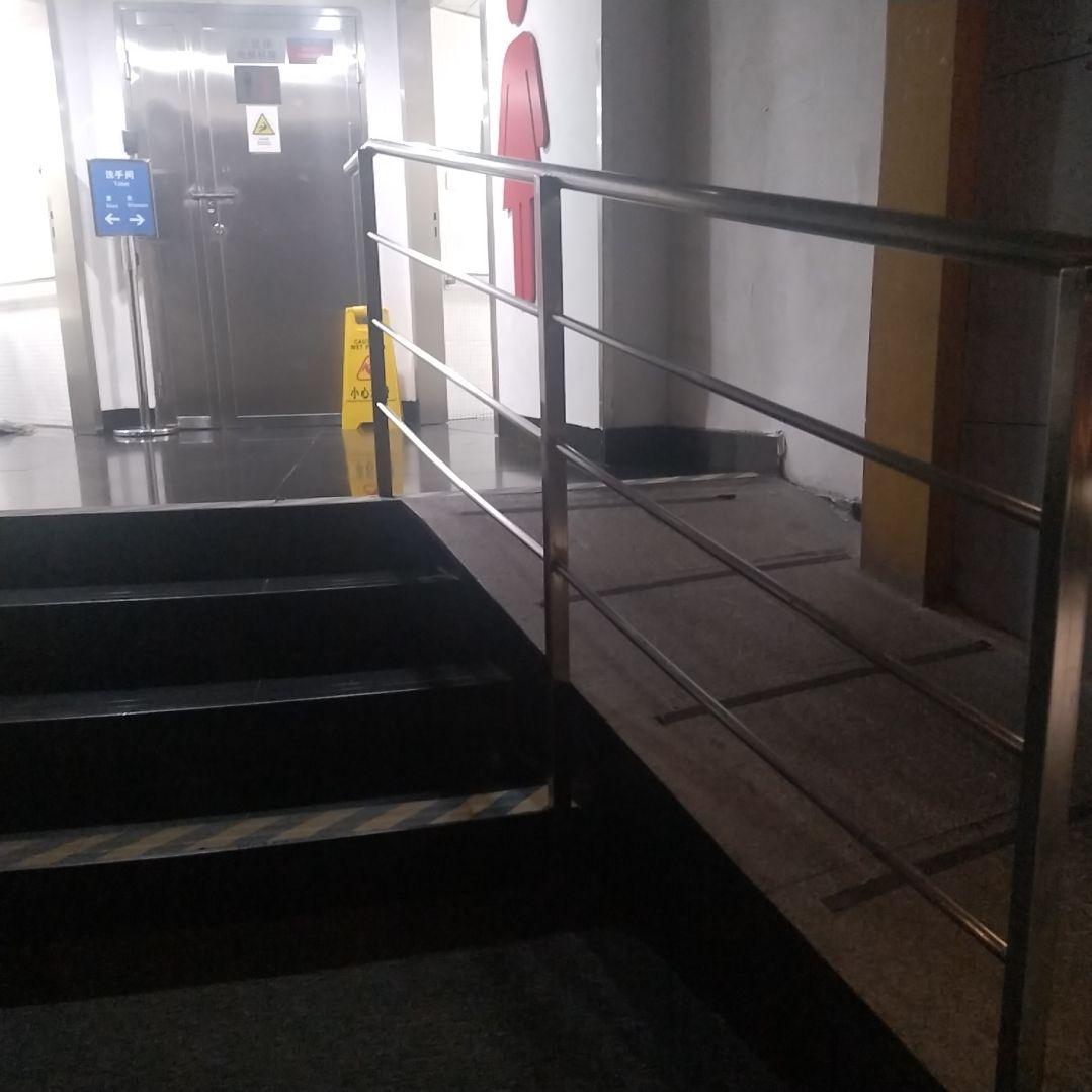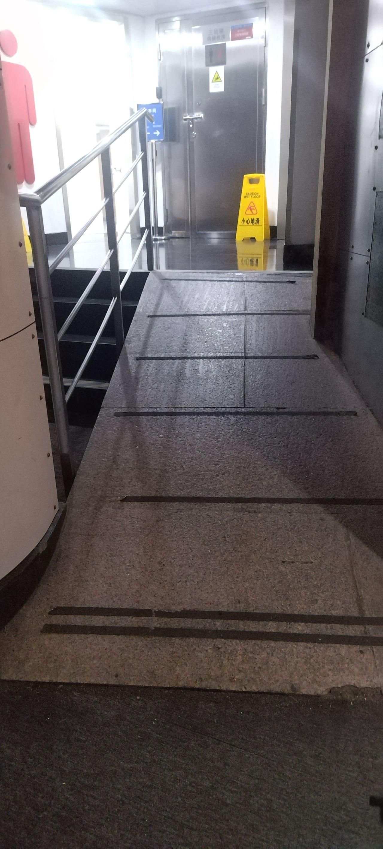 这三张图片是所谓的无障碍通道,对无障碍坡道,应该这样称呼。但是我相信我的拍摄技术不错,而且足够真实,大家看一下这个坡道的角度,我作为普通轮椅,我上不上的去。然后请大家再关注一下第1张图片,他的扶手甚至都不是从最底下开始的,我甚至在轮椅上都不可能拉着扶手上去,因为根本够不到