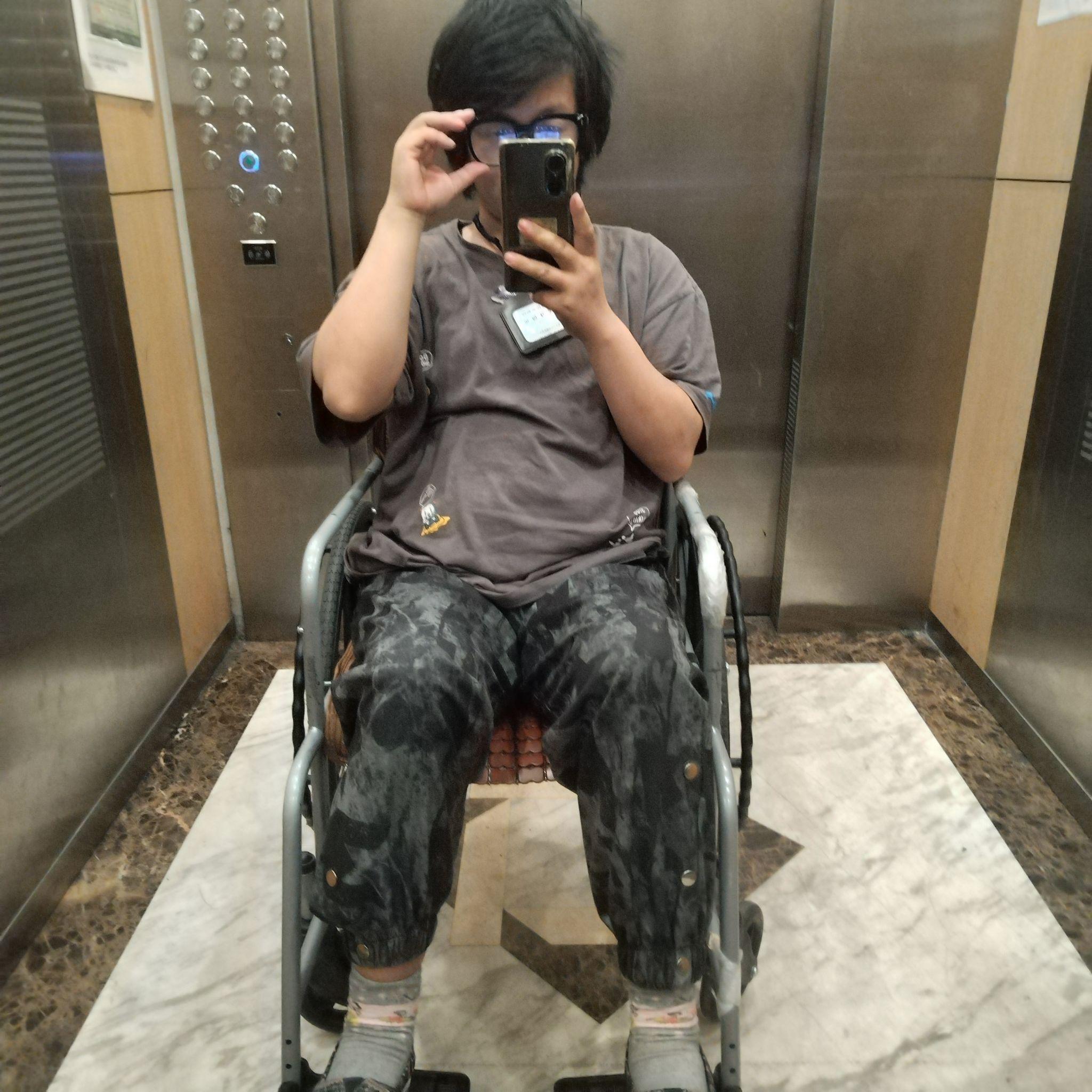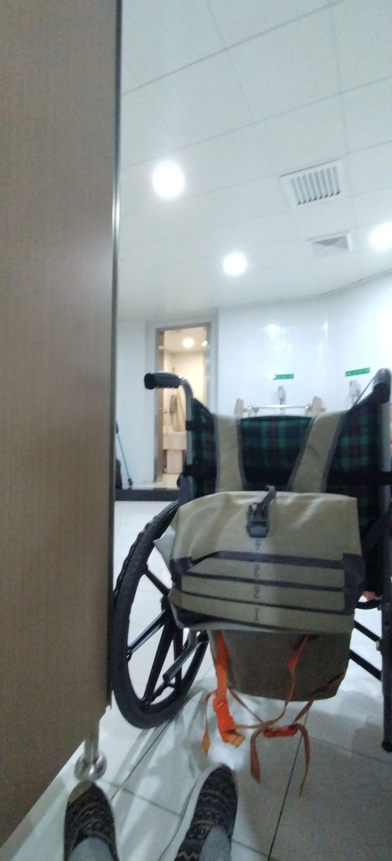 给大家看清楚了,我一直用的轮椅是最普通的轮椅。换句话来说,也就是国家规定的宽度,我都是可以进得去的,没有任何在宽度上面的改装过,跟大家确认一下