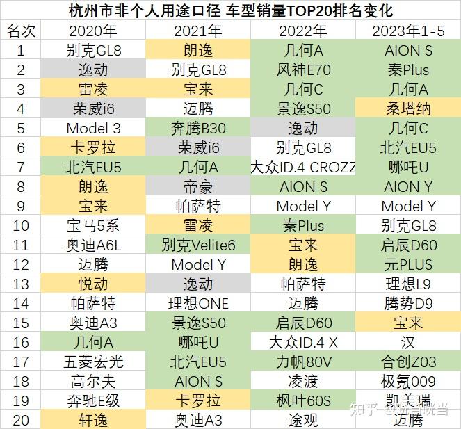 2020年,杭州非个人用途口径的车型新车销量中,排掉GL8等明显不是网约车的公司用途,TOP20里有雷凌等共计6款非新能源网约车,逸动和荣威i6共2款燃油版纯电版都卖的网约车,仅有EU5和几何A两款纯电网约车。