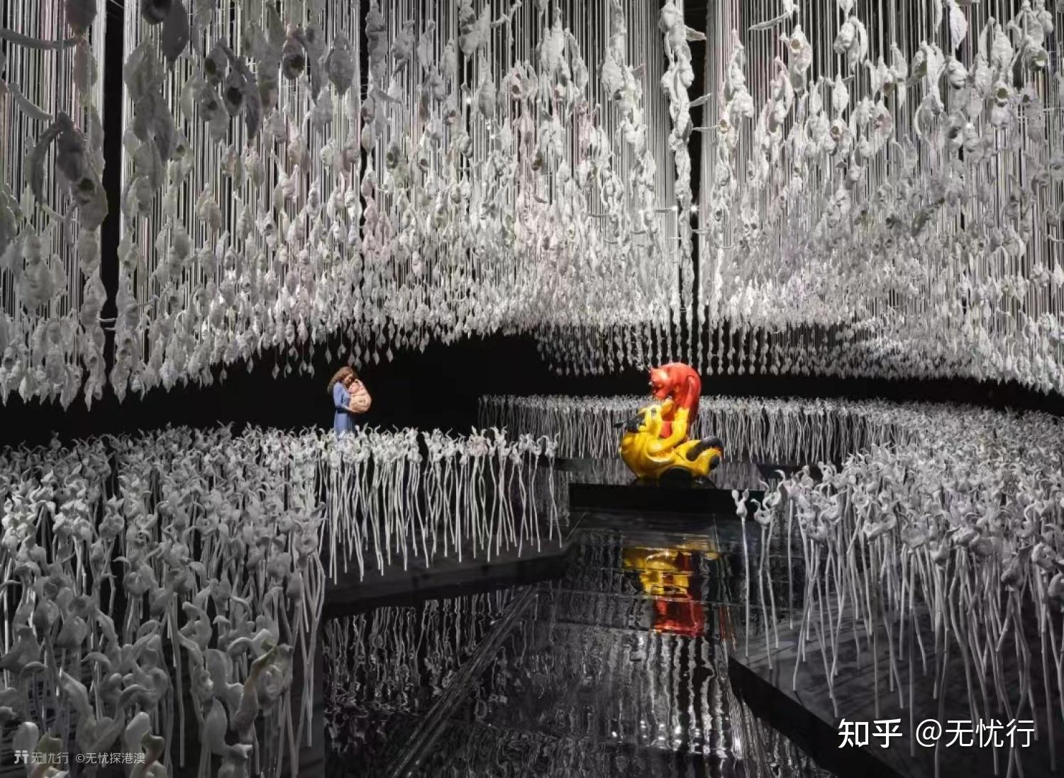 这些雕塑艺术品十分逼真,有长着蝙蝠鼻子的婴儿、面庞像老人的海龟、拥抱人类的驼背海豚人等。三楼还有一个巨型装置—天野,4500株花径,或从天或从地绽开,置身其中,何其震撼。