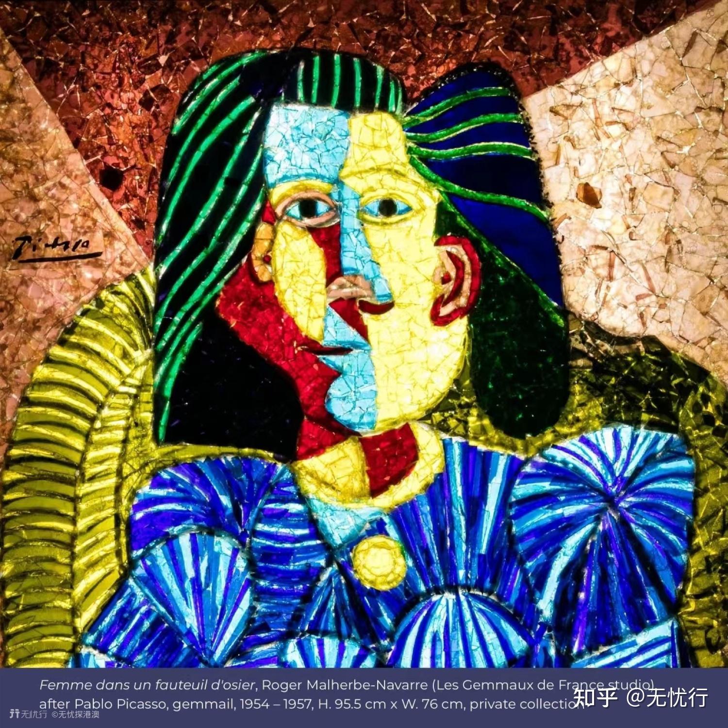 毕加索与法国艺术家罗杰.马莱伯﹣纳瓦尔的工作室合作,利用组合、层叠和黏贴彩色玻璃片的方式,将其部分代表性画作转化为玻璃画,并配合光线投射重新演绎画作。当不同的光线透过玻璃发出五彩斑斓的色彩时,剔透而立体,瑰丽且迷人,每一幅都值得细细观摩欣赏!