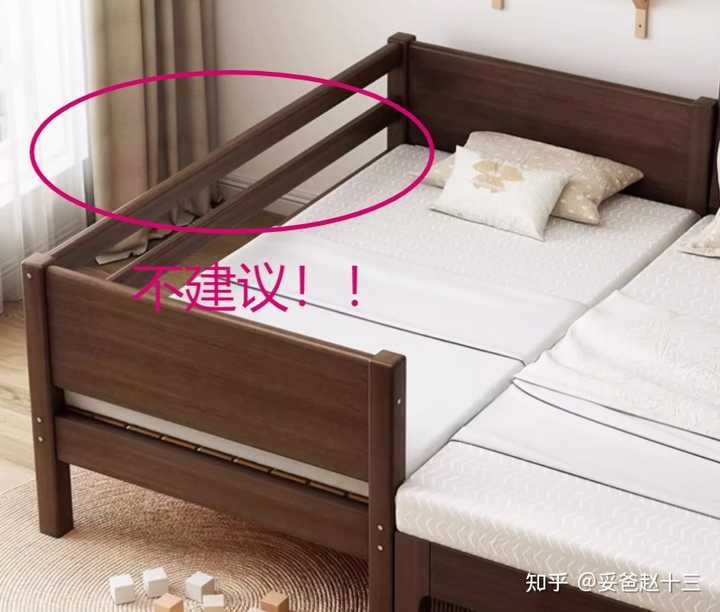 下图这种护栏高度不足,又有横格的强烈不建议!不知道为厂家为什么这么设计,宝宝肯定会有坠床风险。