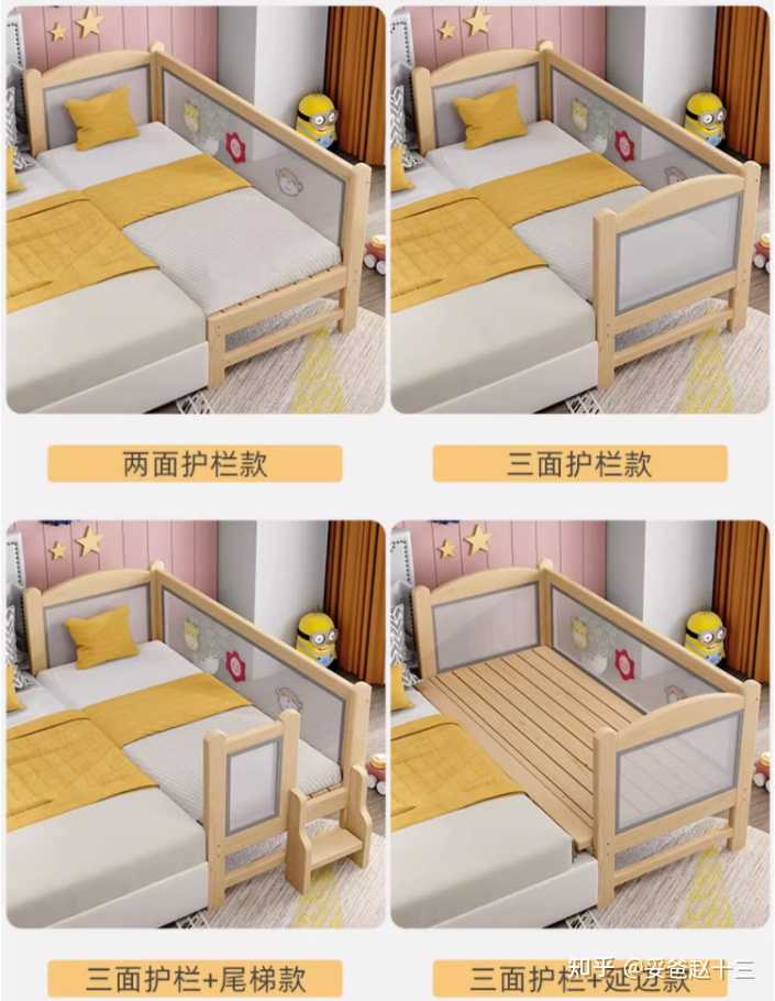 固定侧栏:四边侧栏都是固定的,安全性比较好,但不方便和大人床拼接。