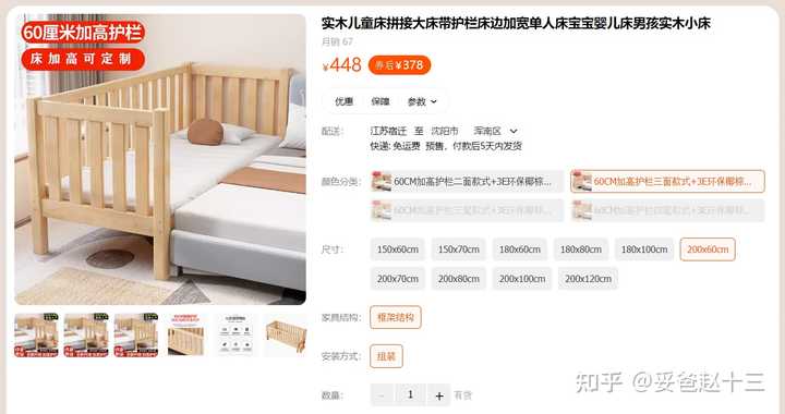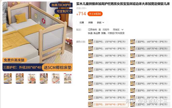 网上找了几款还不错的,大家可以参考,比如这款,60cm护栏、三面护栏,配椰棕床垫,性价比不错,价格是378,我选的是2米长,0.6米宽的。