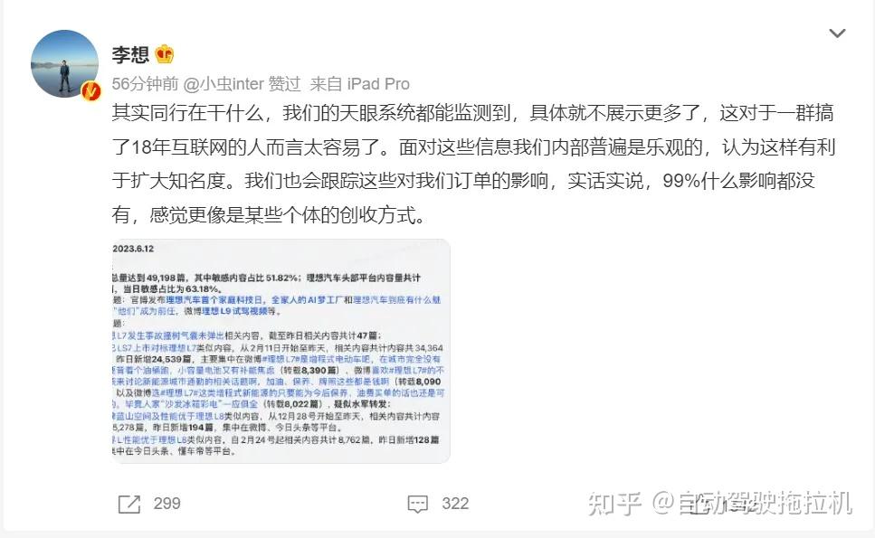 第一回见道歉信还可以这么写,自己的问题避重就轻,还可以把友商挂起来打一顿,牛逼牛逼。我说这么多会不会被李厂长当成水军,给我天眼扫死,不过我估计不够格。md,又给理想扩大知名度了。