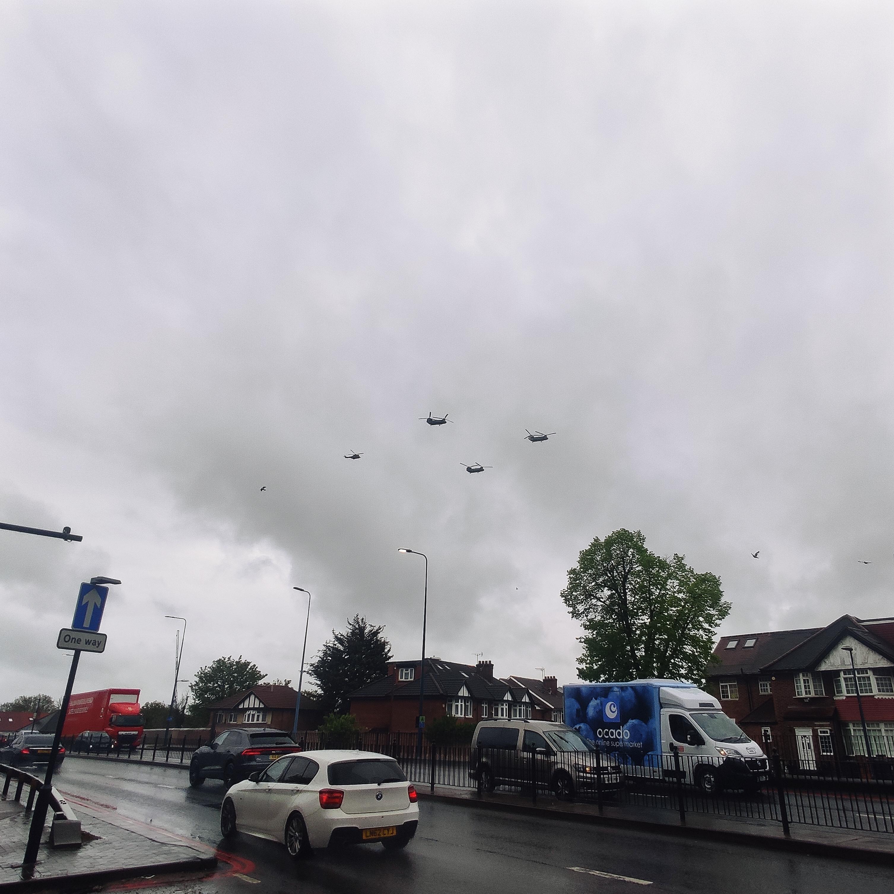 首先声明一下,没加阴间滤镜。这张图可能和大家朴素认知中的好看搭不上边,但允许我介绍一下背景,它拍摄于今年五月六日的伦敦,也就是查尔斯三世加冕的那天。在我回宿舍的路上,巡礼的直升机队头顶飞过