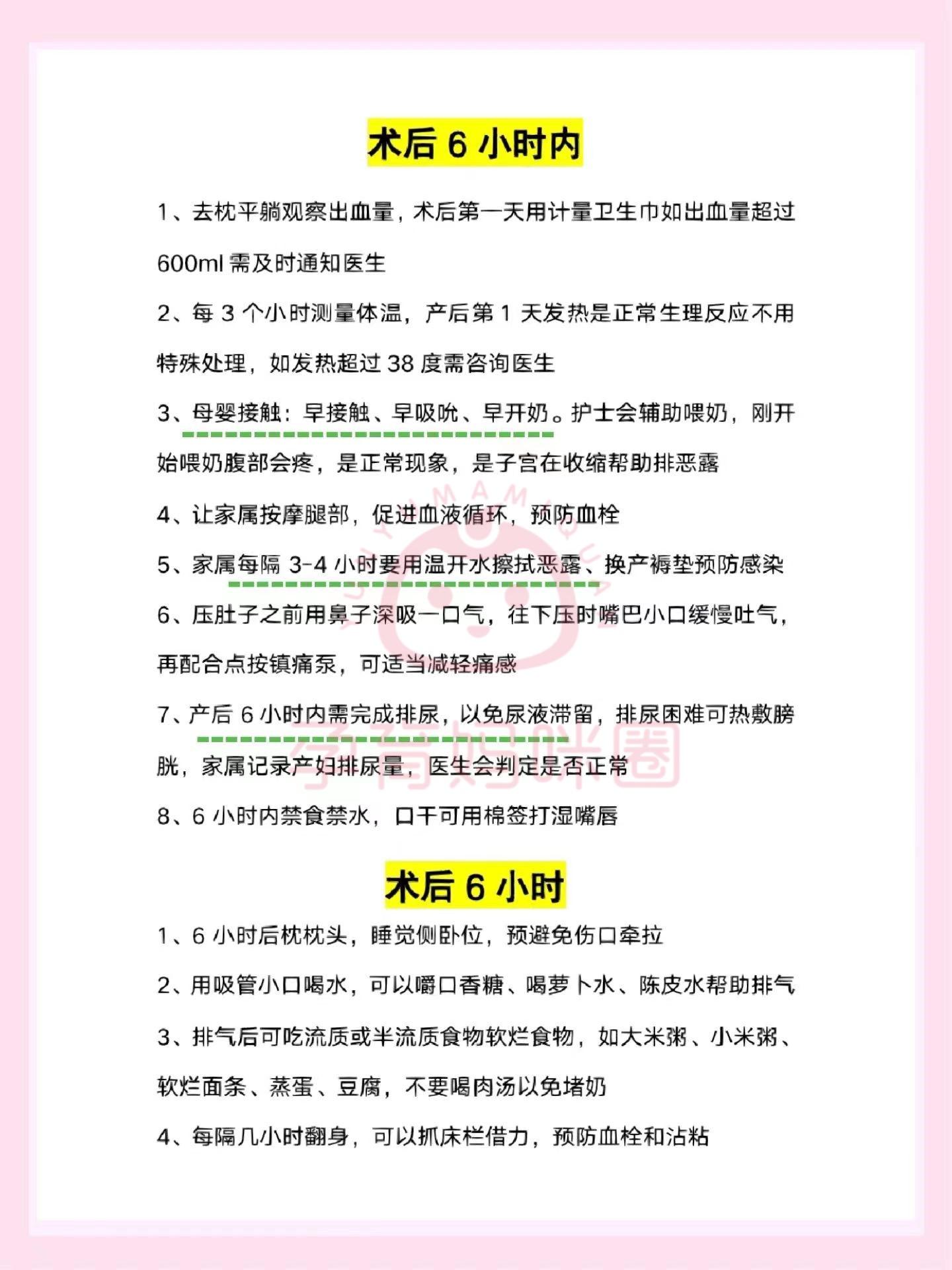 剖腹产的产妇,术后6小时采取去枕平卧位,6小时后可采取半卧位或侧位,24小时拔尿管后需下床活动,适当活动促进肠蠕动,更利于子宫及体形方面的恢复。