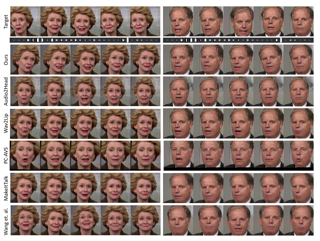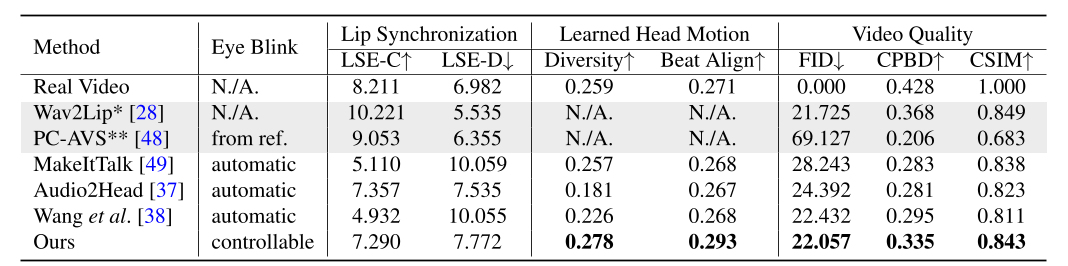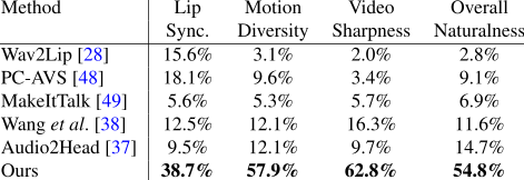Table 1. Comparison with the state-of-the-art method on HDTF dataset. We evaluate Wav2Lip [28] and PC-AVS [48] in the one-shot settings. Wav2Lip* achieves the best video quality since it only animates the lip region while other regions are the same as the original frame. PC-AVS** is evaluated using the fixed reference pose and fails in some samples.
