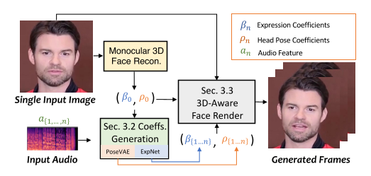 整个方法如图2所示,整个系统利用3DMM系数作为中间表示。首先从原始图像中提取出系数,然后从音频中提取出真实的3DMM的系数(面部表情系数β, 头部姿势ρ),最后通过3D感知面部渲染器生成得到最后的视频。