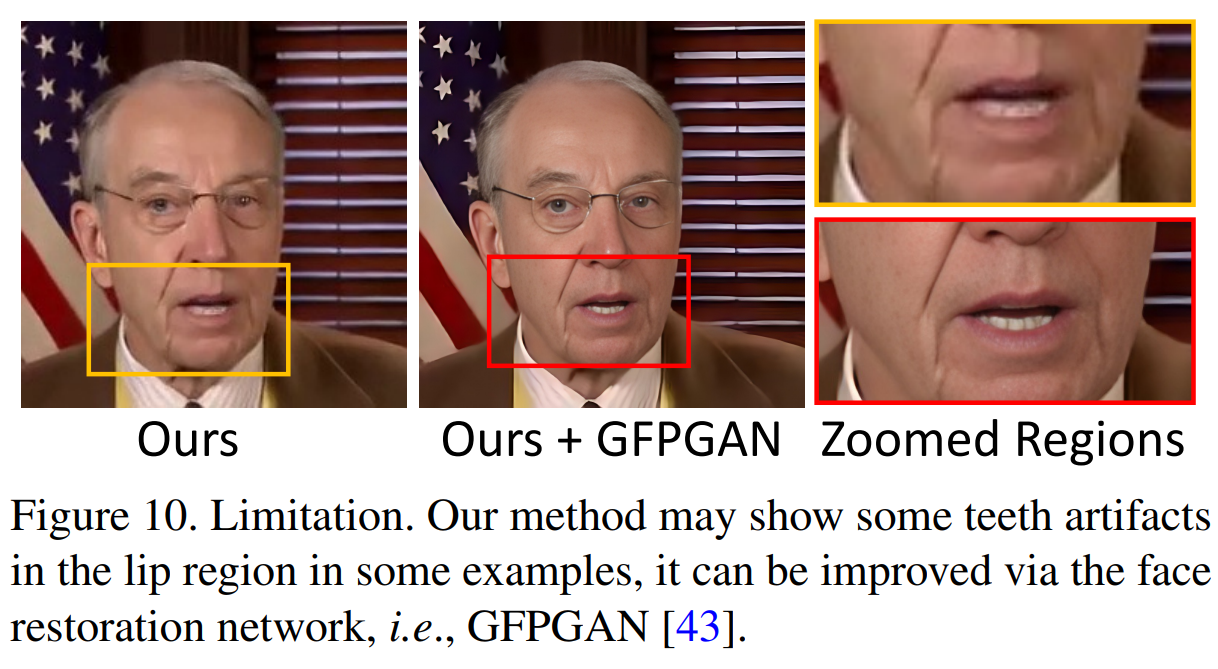 现在SadTalker可以从单张图像和音频生成逼真的视频,但还存在一些限制。由于3DMMs没有眼睛和牙齿的变化,所以Face Render也会在某些情况下无法合成逼真的牙齿,这里面就用GFPGAN来改善这个问题。